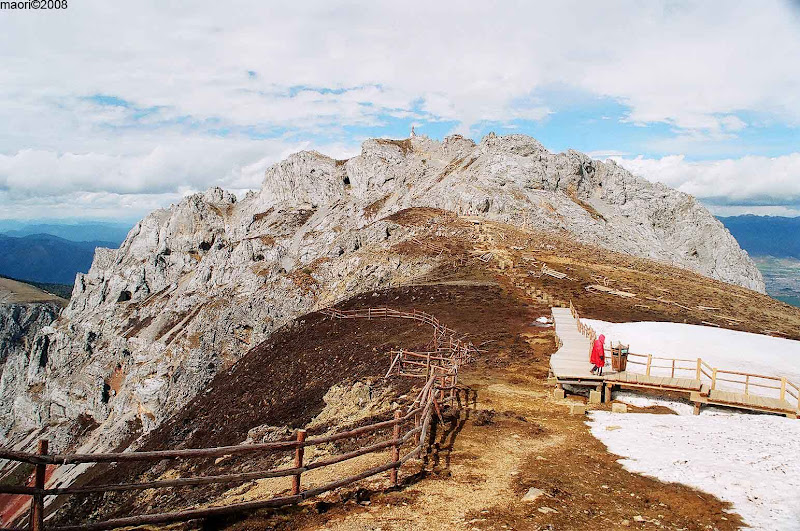 A cable car lift carries passengers from the valley floor up the craggy face of Shi Ka. Around the station at the top are some boardwalks. One can also walk along the mountain slopes. When the weather is good, there is a 360 degree panaoramic view of the high mountains in the region, including the Meili Xue Shan. Unfortunately when we are there it was as usual, cloudy.