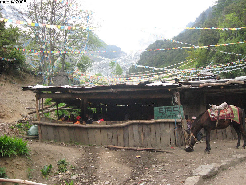6. Mule station at the top. Visible behind the hut is the Minyong Glacier
